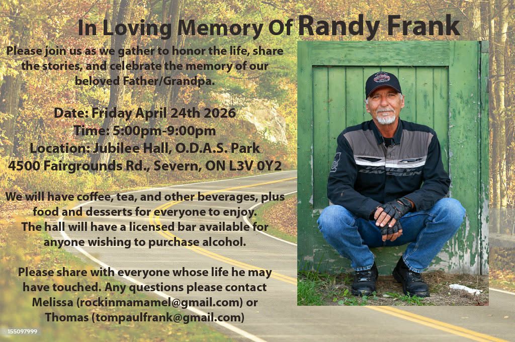Born to Gerald and Shirley Frank in Stratford, Randy grew up with a love for life, laughter and a good story. A Barrie resident, he was happiest surrounded by his three grandkids Bryden, Arabella and Charlotte Zweep, who brought him endless joy and purpose.